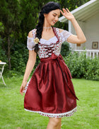 Midilanges Kleid, kontrastfarbene Muster, trennbare Schürze, Seidenband auf der Brust. Dirndl wirkt verführerisch durch das Trachtenmieder mit dekorativer Bänderschnürung im klassischen Stil und die den Ausschnitt umrandende süße Rüschen.